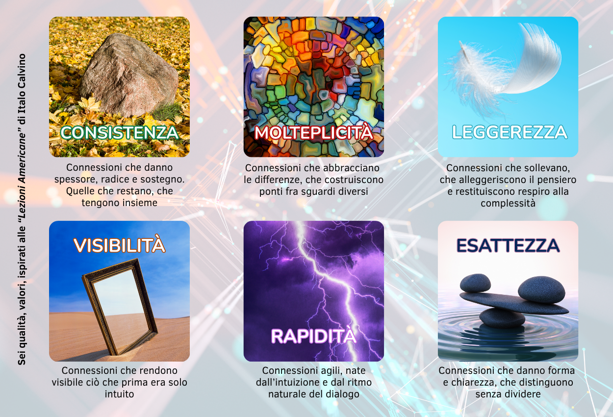 Durante la Rome Future Week (RFW) 2025, nell’ambito dell’iniziativa Asnor dedicata ai Futuri in mutazione, abbiamo tradotto questo principio in un’esperienza concreta: il wall delle connessioni. Ogni partecipante ha scelto una delle sei parole che Italo Calvino, nelle sue Lezioni americane. Sei proposte per il prossimo millennio (1988), ci ha consegnato come eredità per il nuovo millennio: leggerezza, rapidità, esattezza, visibilità, molteplicità, consistenza.