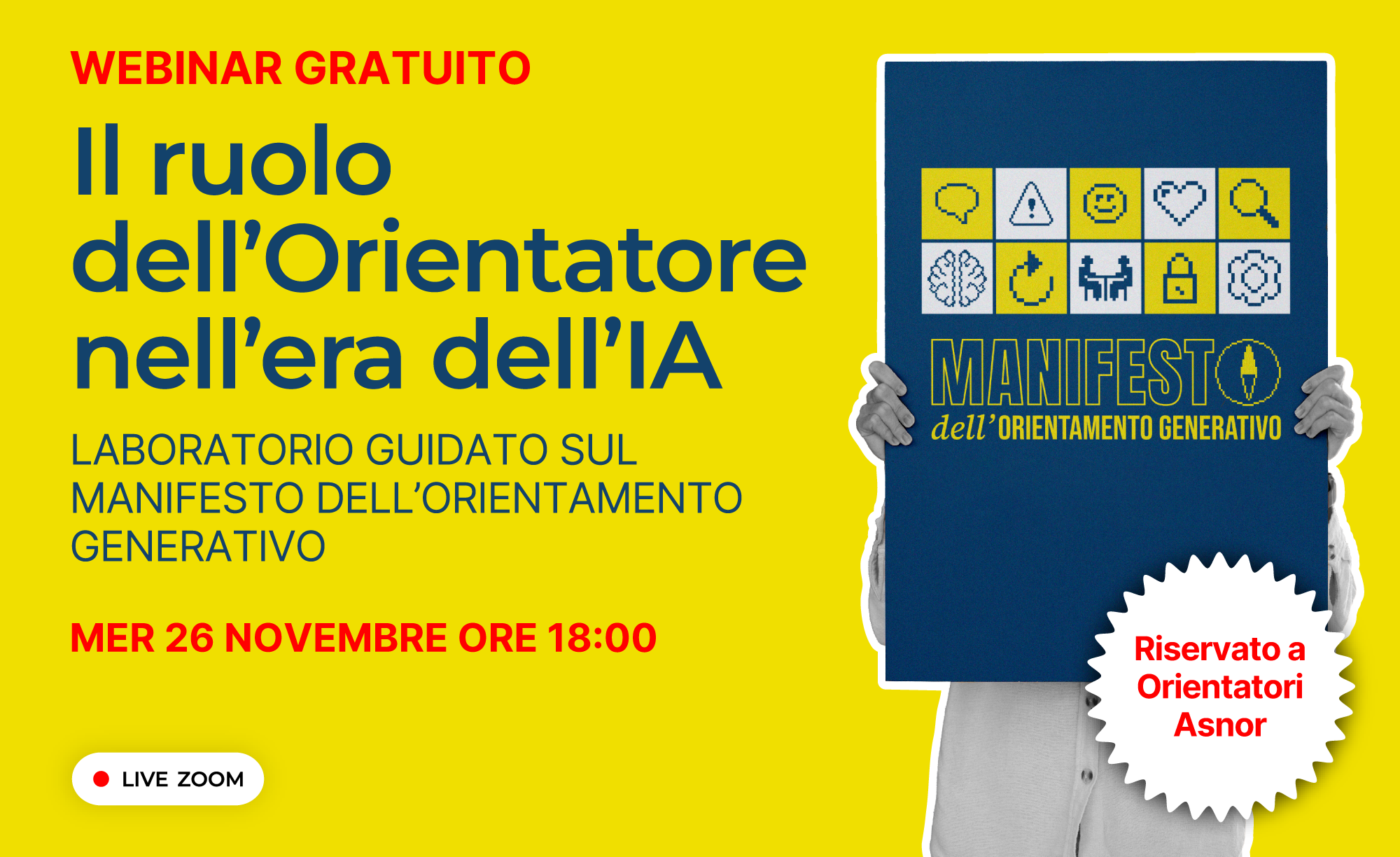 Il Manifesto nasce da un lavoro corale realizzato da un focus group di Orientatori Asnor che, insieme, hanno co-costruito una visione condivisa su come l’orientamento possa rimanere profondamente umano nell’era dell’intelligenza artificiale.